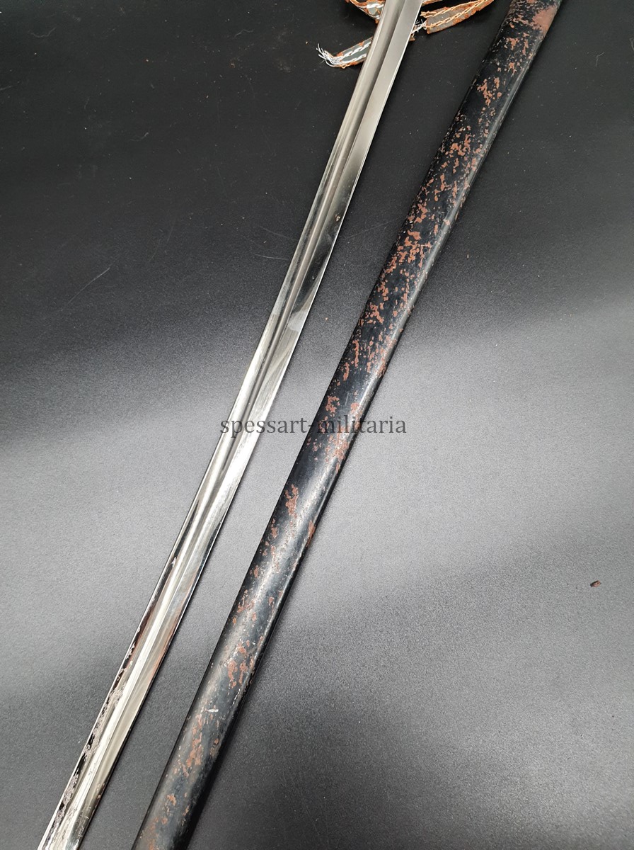 vergoldetes Bügelgefäß schwarzer Bakelitgriff mit Silberdrahtwicklung, blanke einschneidige Klinge, schwarze lackierte Stahlscheide.